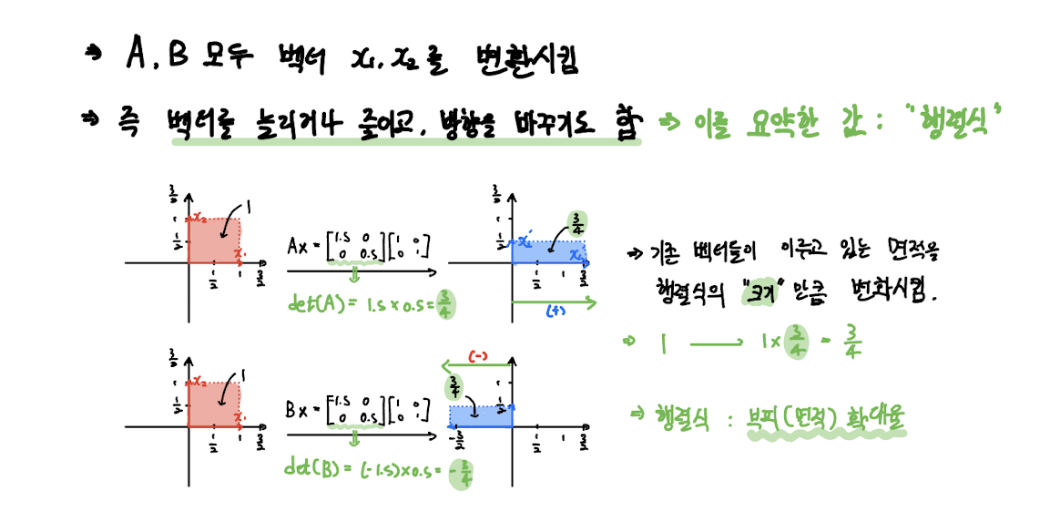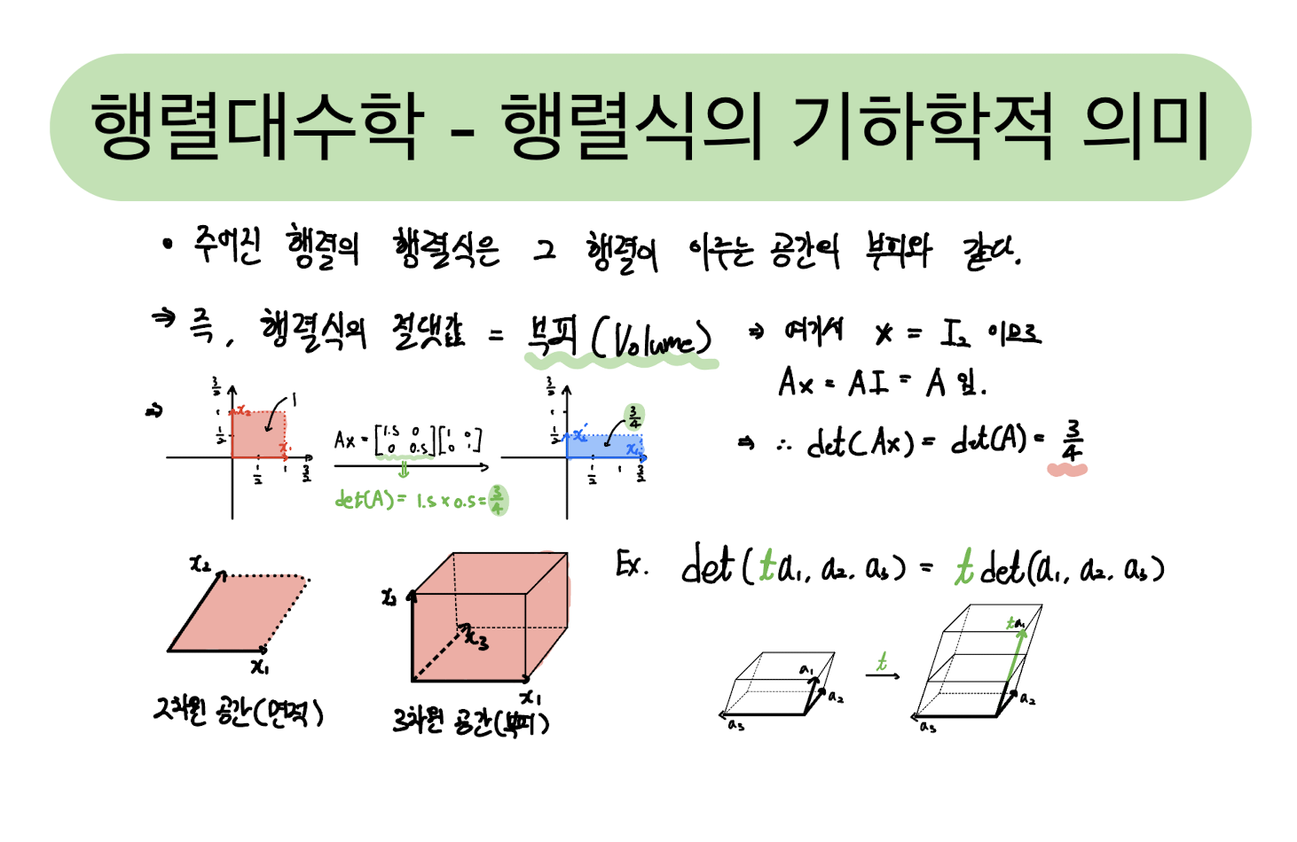 : 행렬식의 절댓값은 선형변환 후의 벡터들이 이루는 공간(ex. 면적, 부피 등)의 '크기'를 나타냅니다.