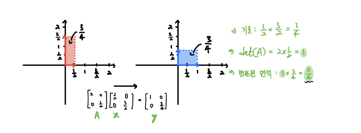 우측 또한 마찬가지로 $det\,(Ax)$ 를 구하면 $\frac{3}{4}$ 가 되고, 이는 실제로 직사각형의 넓이를 대수적으로 구해봐도 동일함을 알 수 있죠.