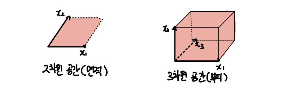 이 벡터들이 이루는 공간의 크기는 '면적'이 되겠죠.