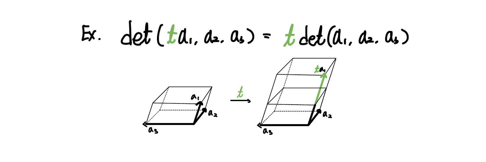 그러므로 부피가 $t$ 배 늘어나는 것과 동일하고, 이때의 부피는 '행렬식'과 같으므로 기존 행렬식에 $t$ 를 곱해준 것과 동일하겠죠.