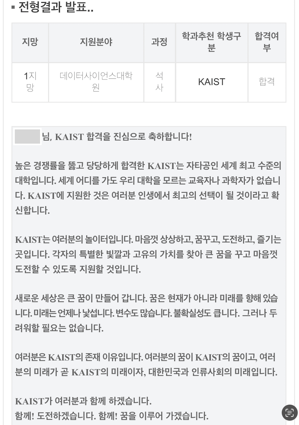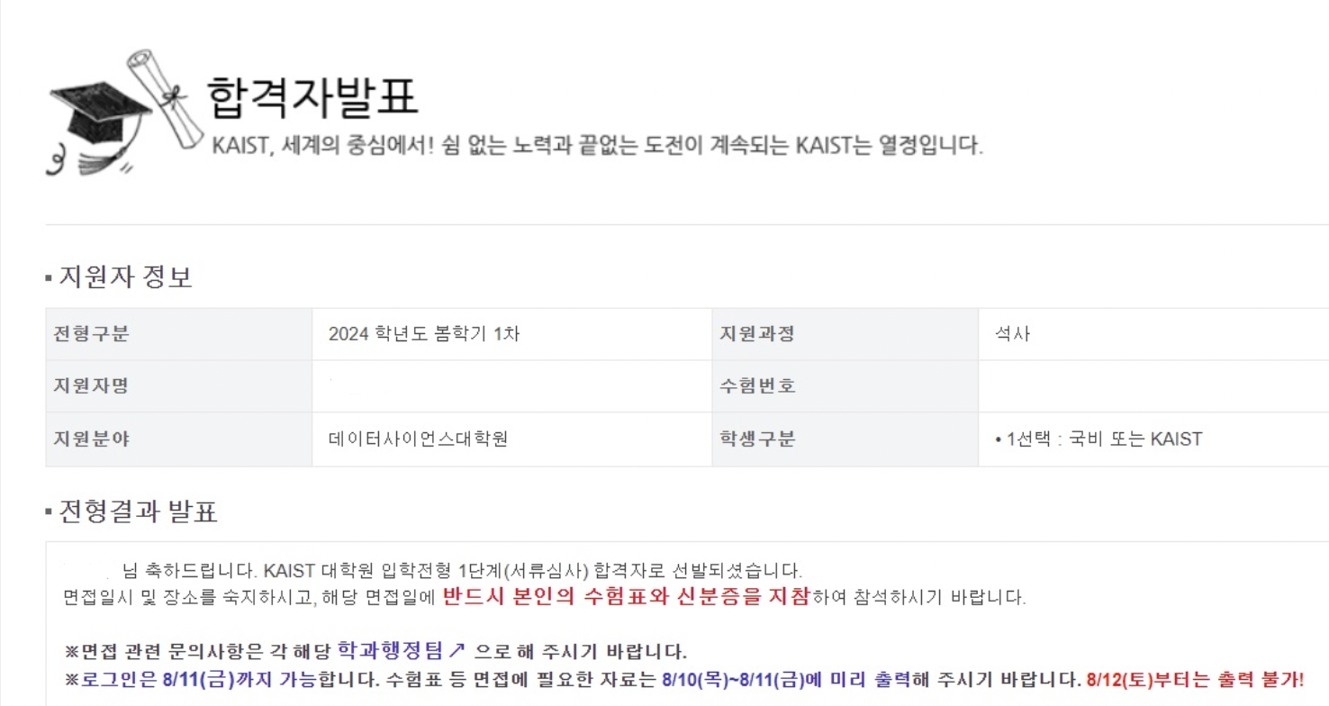 각설하고 첫번째로 제가 진학할 카이스트 데이터사이언스 대학원 합격 후기부터 작성해보겠습니다.
