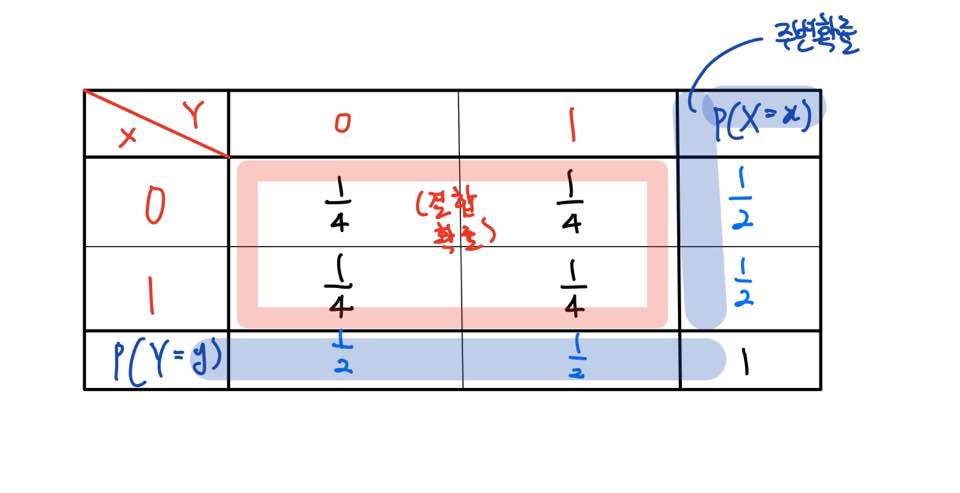 이는 위 결합확률테이블에서 각 결합확률을 더해보시면 1이 됨을 통해 쉽게 확인하실 수 있습니다.