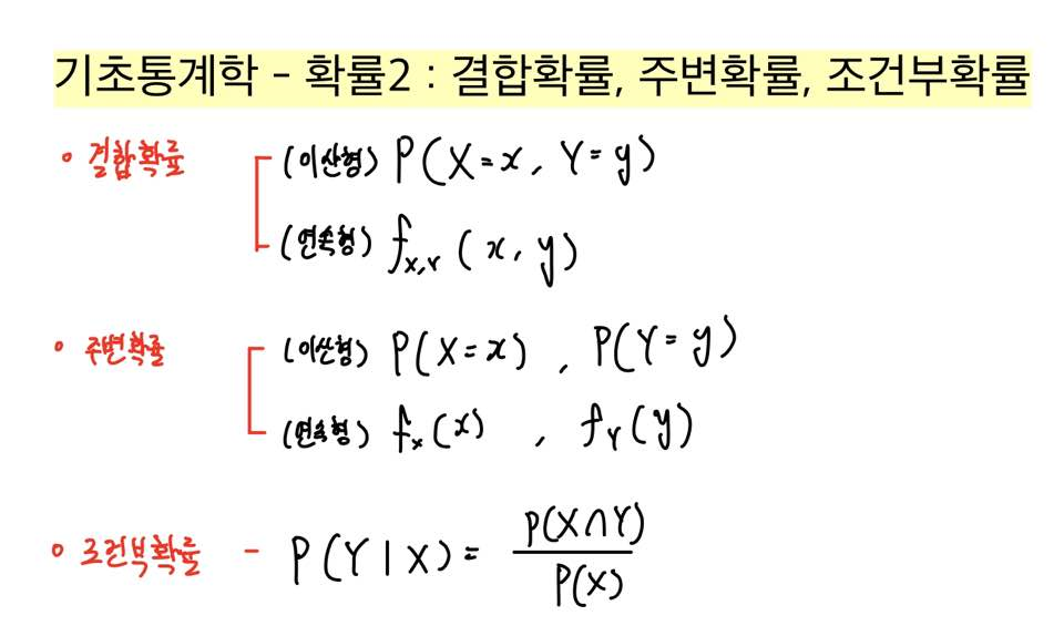 사실 중간에 확률질량함수니, 확률밀도함수니, 조건부확률밀도함수니 등의 개념이 나오긴 합니다만 그냥 변수의 유형에 따라 개념의 사용이 약간씩 차이날 뿐 틀 자체는 동일합니다.