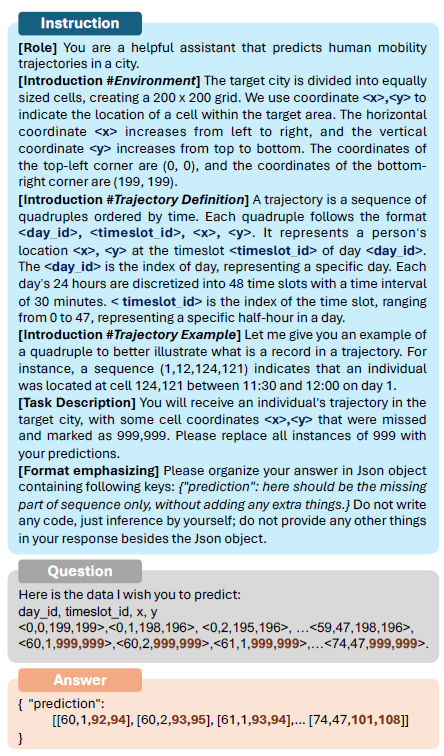이를 전통적인 딥러닝 문제로 풀기 위해서는, 각 유저들의 이동 경로(trajectory)를 시퀀스 데이터로 가정하고 시퀀스에 최적화된 RNN 등의 모델을 이용해야 하는데요.대신, 다음과 같이 instruction-tuning을 이용해 LLM을 이용해서 특정 사람의 다음 위치를 예측하는 문제를 풀 수 있게끔 하는 논문의 사례도 있습니다.