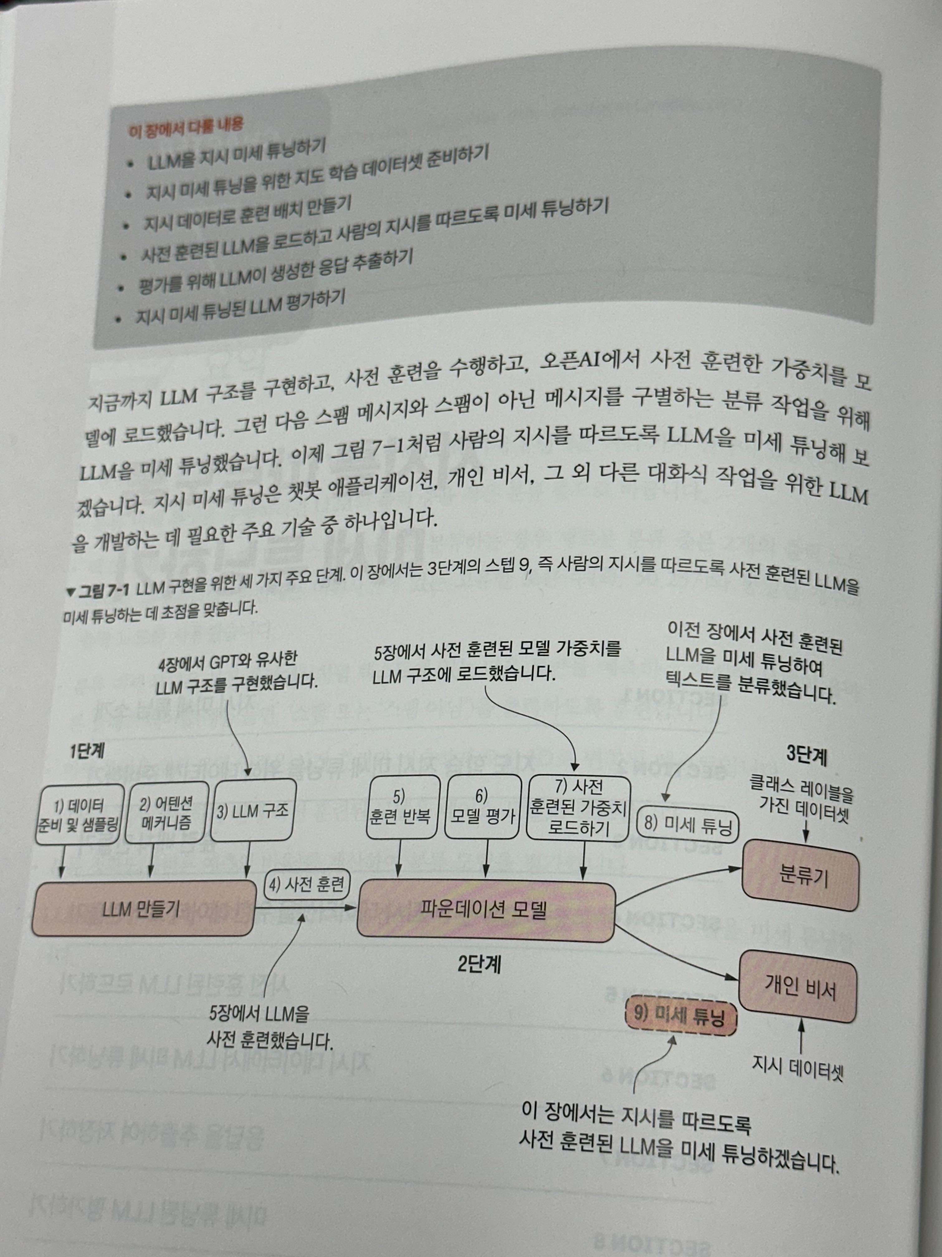 제가 관심있는 섹션은 7장인 지시 미세 튜닝, Instruction fine-tuning 인데요.