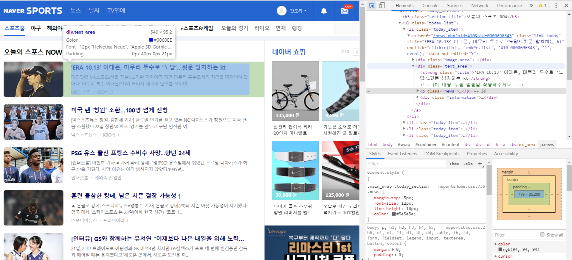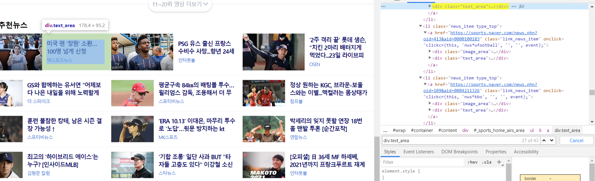 저 네이버 스포츠를 예시로 들어서 각 선택자를 찾아보겠습니다.