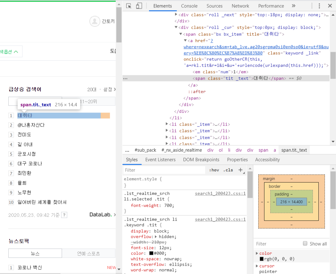 만약 내가 원하는 정보가 네이버 검색창에서의 '실시간 검색어'라면, 실시간 검색어를 담고 있는 태그를 찾는 것이 중요하겠죠?