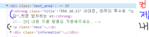 컨테이너는 같은 구조로 이루어져 있으므로, 컨테이너 내에서 기사 제목과 기사 내용에 해당하는 선택자를 파악한다면 쉽게 정보를 수집할 수 있다는 것이죠.
