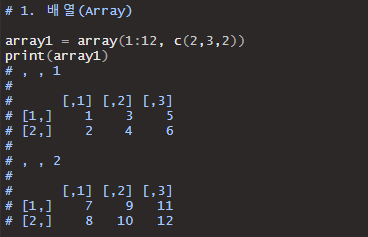 1부터 12까지의 숫자형 데이터를 2 x 3의 매트릭스를 2개로 만든 후, 이를 쌓은 형태로 표현하였습니다.
