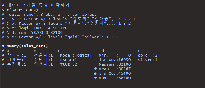 또한 우리가 불러온 데이터의 특성을 파악하는 방법은 str( )이란 함수와 summary( )라는 함수를 사용합니다.
