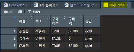 | 이름 | 주소 | 구매 여부 | 구매액 | |