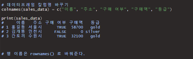 변수명을 바꾸고 싶을 땐 colnames( )이란 함수를, 행이름을 바꾸고 싶을 땐 rownames( )를 사용해줍니다.