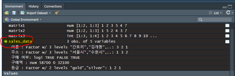 즉, 행렬과 유사한 2차원 구조이지만, 각각의 독립적인 데이터 타입을 Column에 담아낼 수 있기 때문에, R프로그래밍에서는 데이터 프레임이 가장 빈번하게 사용되고, 핵심적으로 사용됩니다.
