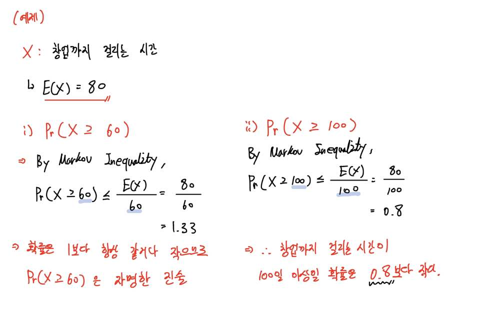 이처럼 마르코프 부등식은 확률분포에 대한 가정 없이 기댓값만 갖고도 확률 추정을 할 수 있게 해주는 강력한 도구입니다.