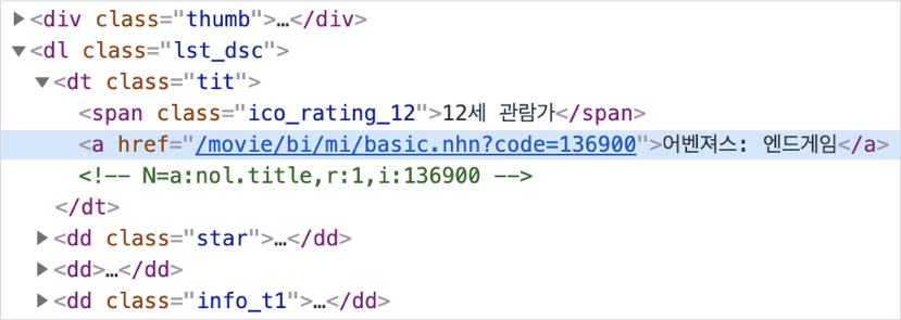 어벤져스: 엔드게임의 세부페이지로 접속되는 링크가 a 태그 안에 속성(attribute)으로 있는 걸 알 수 있습니다.
