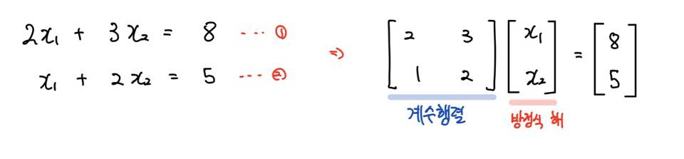 그리고 방정식의 해로 이루어진 [x1 x2] 부분을 일반적으로 벡터(vector)라고 부릅니다.