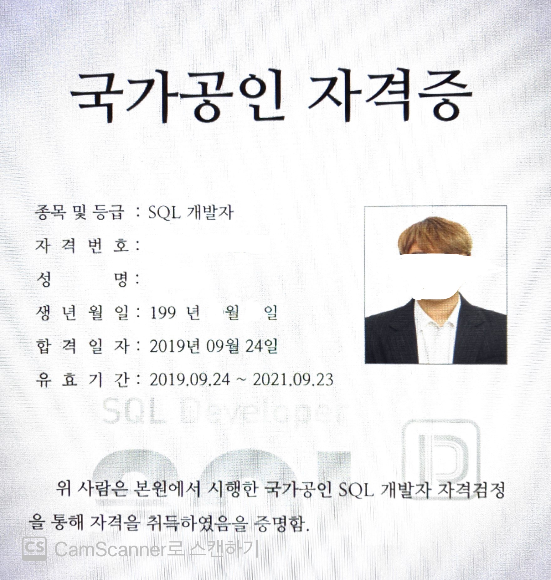 오늘은 국가공인 자격증 중 하나인 SQL 개발자 자격증의 취득 후기를 작성해볼까 합니다.