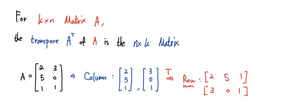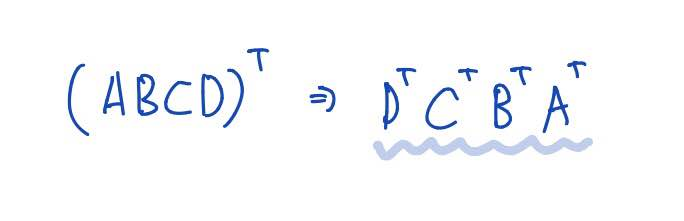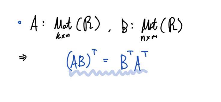 임의의 k x n 행렬 A와 n x m 행렬 B에 대하여 다음과 같이 전치가 성립합니다.