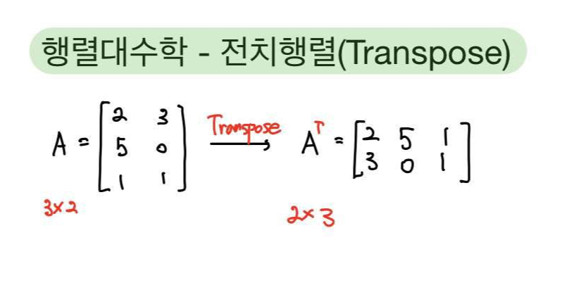 즉 행렬 A가 3x2 사이즈의 행렬이라고 가정하면, 전치행렬 AT는 2x3 사이즈의 행렬이 됩니다.