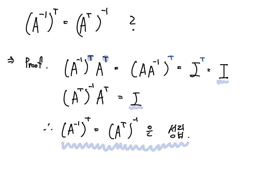 어려운 증명은 아닌데, 역행렬의 전치와 전치행렬의 역행렬이 같은지 증명하는 문제입니다.
