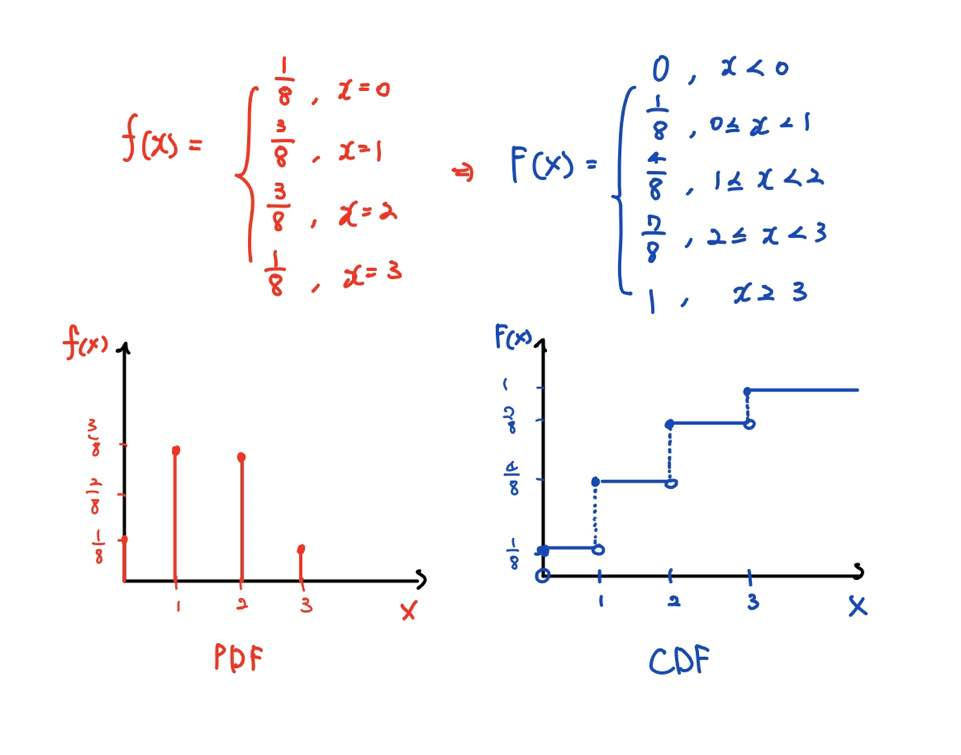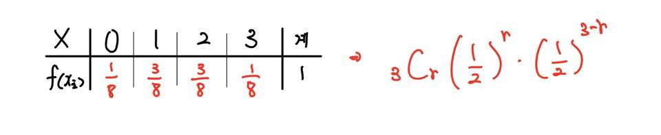 확률변수 X가 동전을 3회 독립반복하여 던졌을 때 나온 앞면의 수라고 가정하면, X가 가질 수 있는 값은 0, 1, 2, 3이며 이에 대응되는 확률은 위와 같습니다.