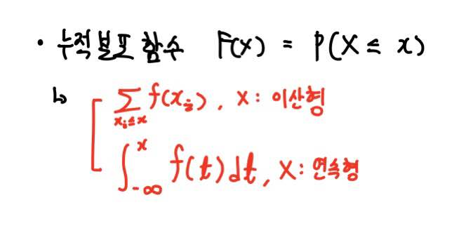 누적분포함수는 확률변수가 임의의 값 x 이하인 모든 값을 가질 확률을 누적함으로써 정의됩니다.