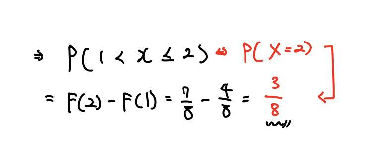 P(1 < X <= 2)일 확률은 결국 P(X=2)와 같으며, 이는 누적분포함수의 뺄셈과 같음을 알 수 있습니다.