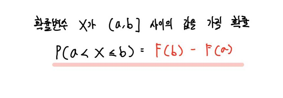 그렇기에 확률변수가 구간 (a, b] 사이의 값을 가질 확률은 누적분포함수를 이용하여 위와 같이 구할 수 있습니다.