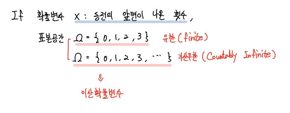 동전을 던지는 시행을 무수히 반복한다고 가정하면 0, 1, 2, 3 ... 등 셀 수 있는 무한개인 가산무한일 수 있습니다.