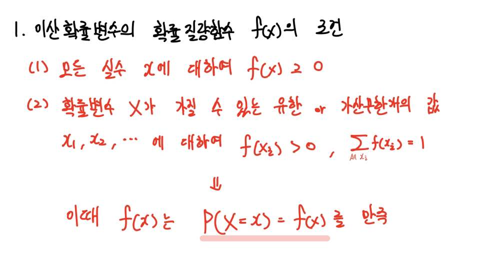 확률변수가 가질 수 있는 값에 대해서는 항상 0보다 커야겠으며 그 합은 1이 되어야 할 것입니다.