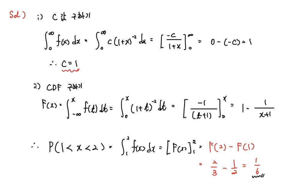 먼저 상수 c의 값을 구하고, 확률밀도함수를 적분하여 누적분포함수 꼴로 나타낼 수 있어야 하겠죠?