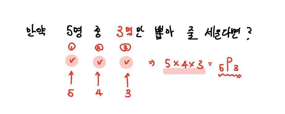 만약 5명 모두 줄 세우는 것이 아니라, 5명 중 3명만 뽑아서 순서대로 줄을 세운다면 어떨까요?