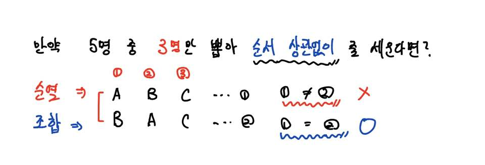 그렇다면 다시 n명의 사람 중에서 k명의 사람을 고르지만, 순서와 상관없이 '고르기만 한다'고 가정합시다.