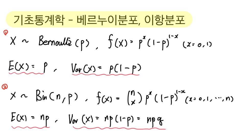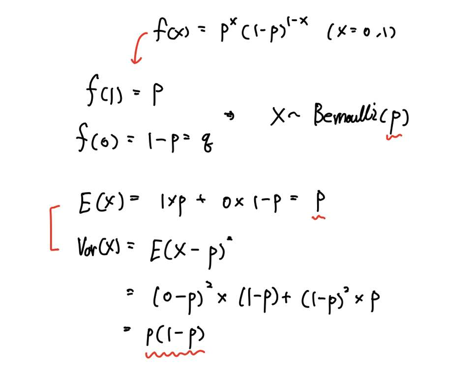 이를 이용해 베르누이 확률변수 X의 기댓값 = p, 분산 = p(1-p)가 됩니다.