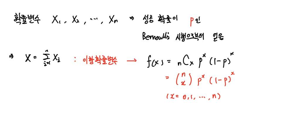 이러한 n개의 베르누이 확률변수의 합으로 나타내어지는 변수를 X라고 정의하면, 이때 X는 이항확률변수라고 합니다.