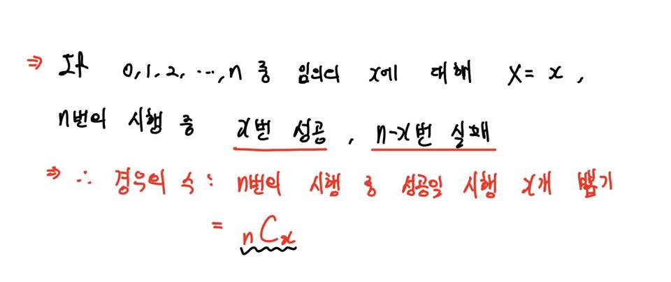 따라서 이에 상응하는 경우의 수는 n번의 시행 중 성공인 시행 x번을 뽑는 것과 같으므로 nCx입니다.
