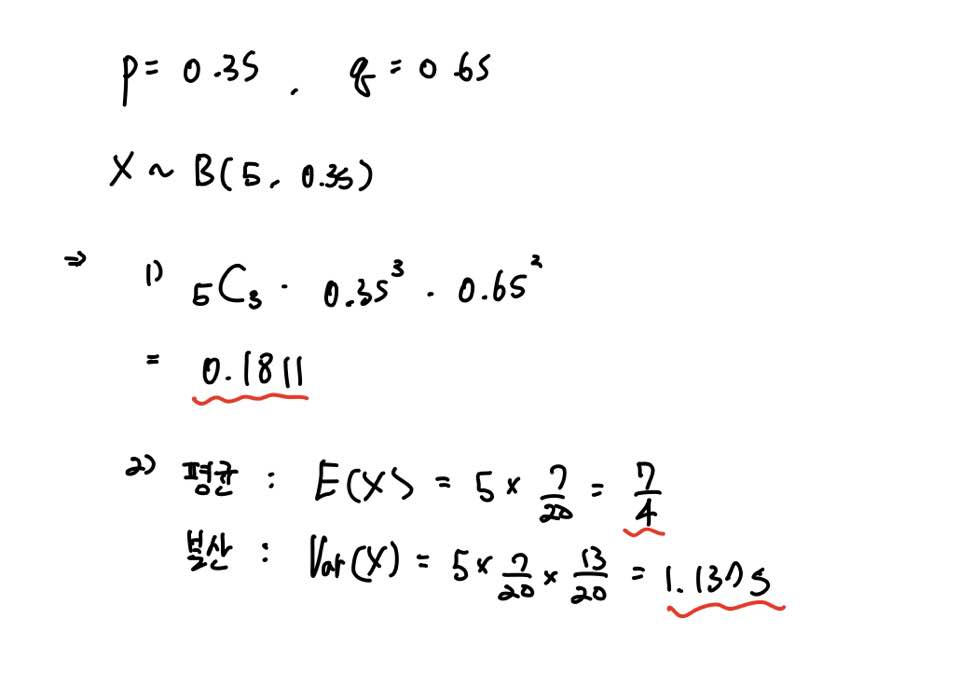 Ex. 프로농구에서 어떤 농구선수의 3점슛 성공률이 35%라고 가정하자. 이때 이 선수가 5번을 던질 때 3점슛이 3번 성공할 확률을 계산하고, 기댓값과 분산을 구하라.