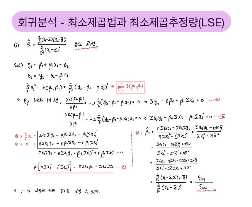 정리하면 이러한 방식을 최소제곱법(Least Square Method)라고 하며, 최소제곱법을 통해 얻어낸 추정량을 최소제곱추정량(Least Square Estimator ; LSE)라고 합니다.
