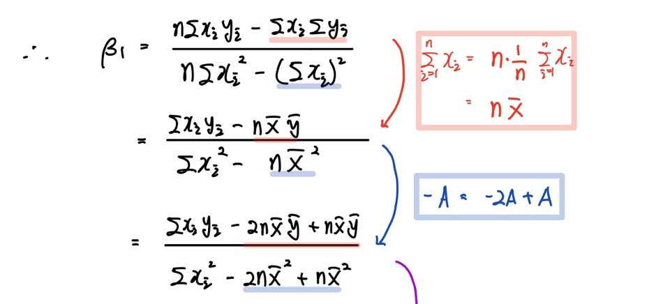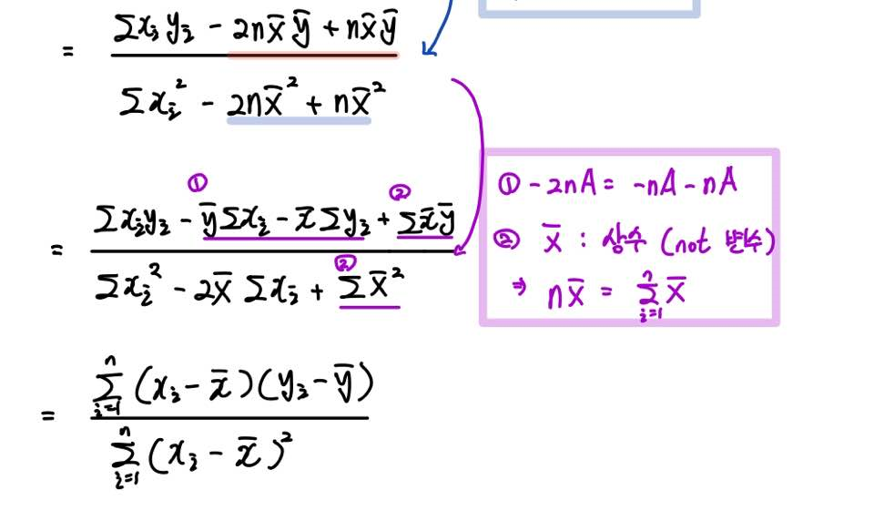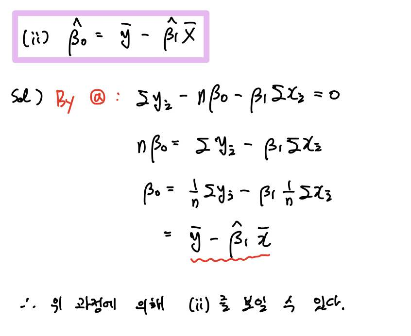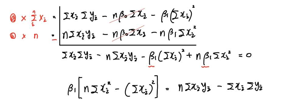 그러한 맥락에서 β0가 있는 항을 소거하기 위해 (a)식에는 sigma_xi를, (b)식에는 n을 곱해줍니다.