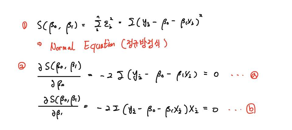 이를 각 β0, β1에 대해 편미분을 해주면 식을 2개 얻을 수 있는데요.
