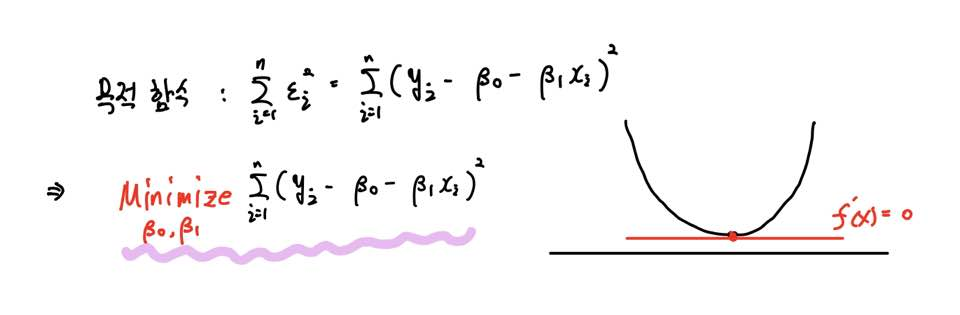 따라서 이 다변수함수를 목적함수로 세우고, 최소화하는 과정을 통해 β0, β1의 Estimator를 구해보겠습니다.