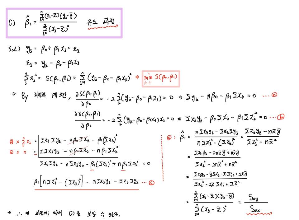 β1 의 최소제곱추정량 유도 과정을 한 페이지에 정리하면 다음과 같습니다.