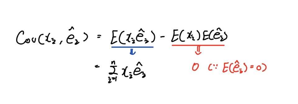 이때 E(Xi)E(e_hat)(: 설명변수의 기댓값*잔차의 기댓값)은 잔차의 기댓값이 0이므로,