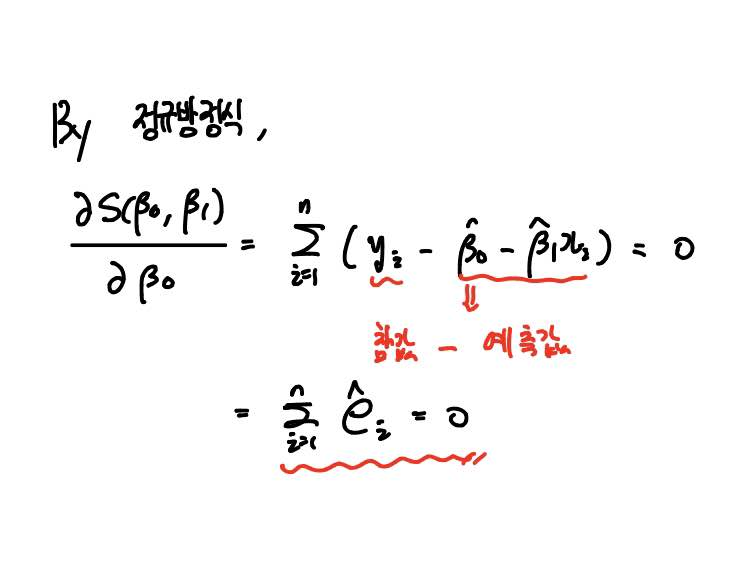 잔차제곱합을 β1에 대하여 편미분한 값이 우측 식과 같으며, 이 식은 1계조건에 의해 0이 되어야 했죠.