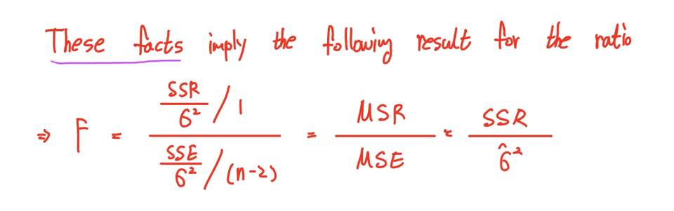 다음과 같이 F(1, n-2)분포를 따르는 F-통계량을 유도할 수 있다는 것입니다.