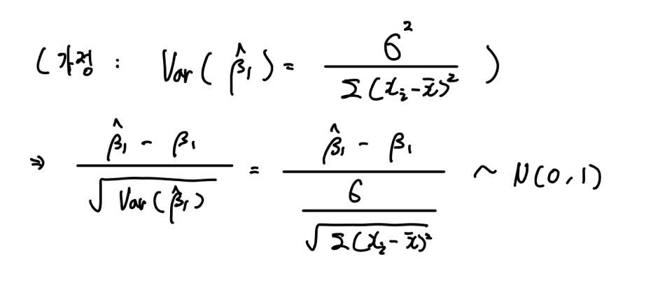 자 그래서 위와 같이 β1의 Estimator에 대해 표준화를 해주면 기댓값이 0이고 분산이 1인 표준정규분포 N(0,1)를 따르게 됩니다.