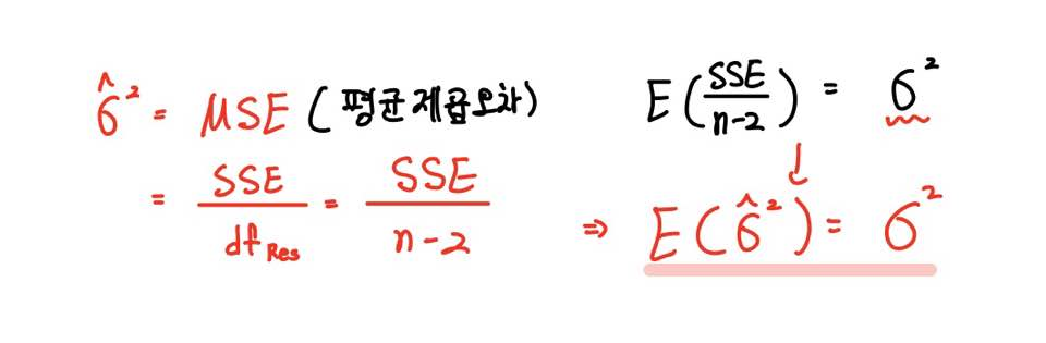 그렇기에 이 모분산의 추정량, 즉 MSE의 기댓값은 우측에서 볼 수 있는 것처럼 오차항의 모분산이 되며,