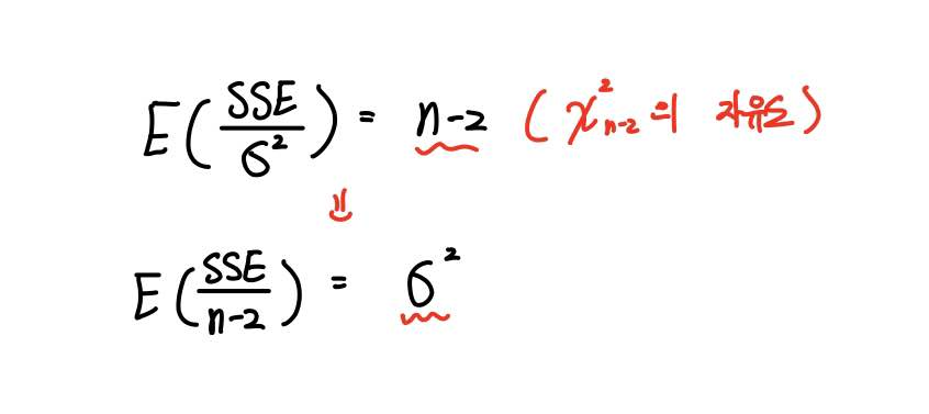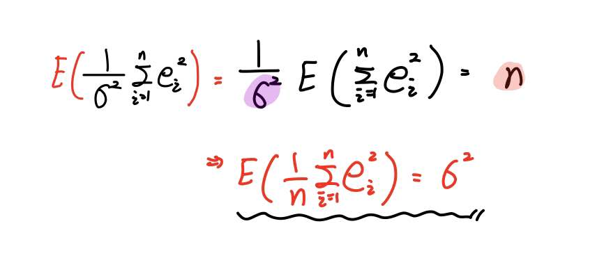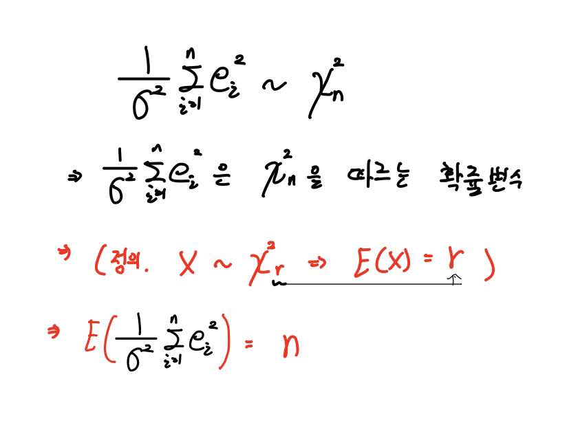 위와 같이 σ²과 n의 위치를 서로 바꿔주면 SSE를 n으로 나눠준 값의 기댓값이 σ²이 되는 것을 알 수 있습니다.