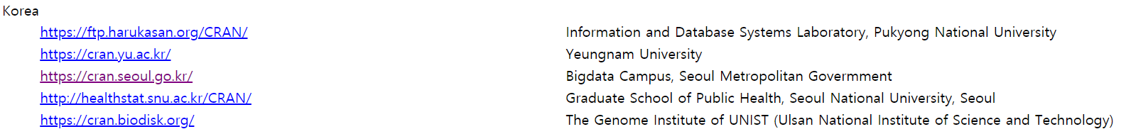 국가별로 R을 다운 받을 수 있도록 미러링 사이트(?)를 구축해놓은 건데요.