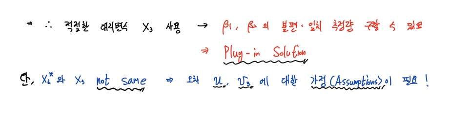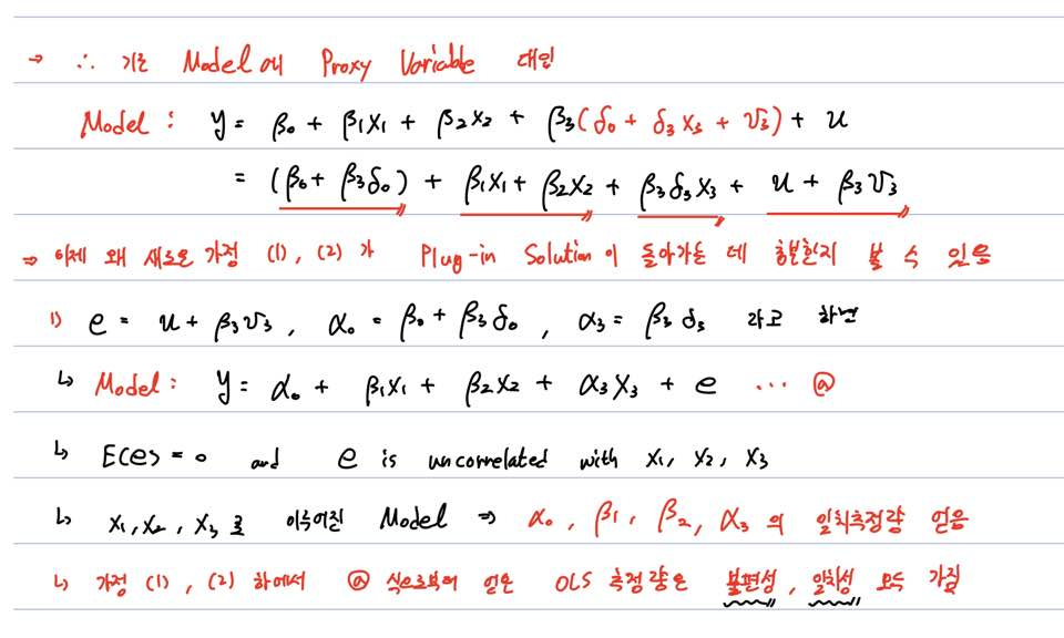 따라서 Omitted Variable을 효과적으로 대체할 수 있는 좋은 Proxy를 쓴다면 불편성과 일치성을 만족하는 추정량을 구할 수 있습니다.
